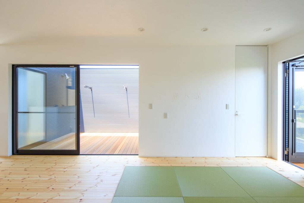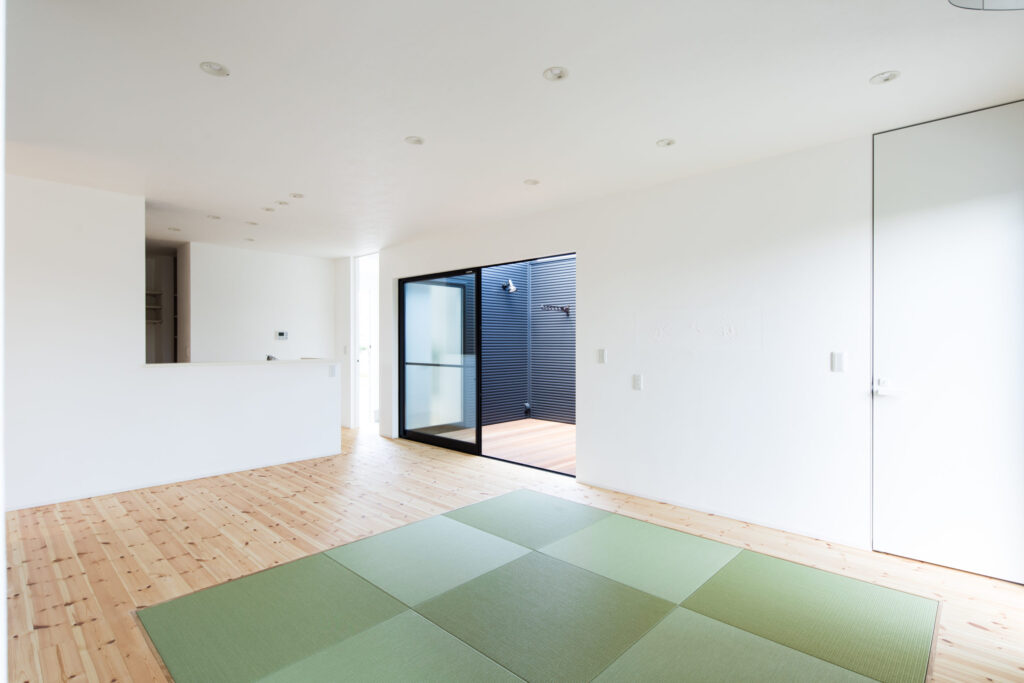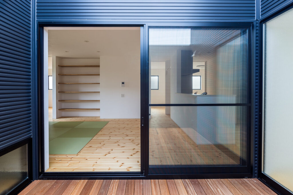 外回りは真っ黒な外壁でインパクトがある家。でも中に入れば中庭の外壁は白で柔らかい印象に。